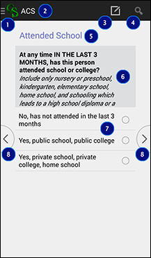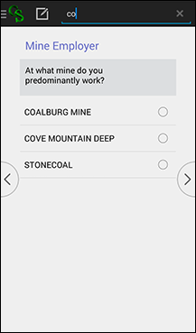 Clicking on the CS icon brings up the case tree. The case tree displays all fields that have been entered in the data entry application, showing the field label as well as the field response. If you click on a field, you will be taken to that field. This allows you to quickly move from one part of the questionnaire to another. Once the case tree is shown, clicking on the CS icon again will take you up the hierarchy of the data entry application. For example, you might go from seeing details about a person to seeing details about the household. To insert or delete a repeating occurrence, hard-press on the occurrence label until you are presented with a menu that allows for insertions and deletions. You can dismiss the case tree by using the Android back button.