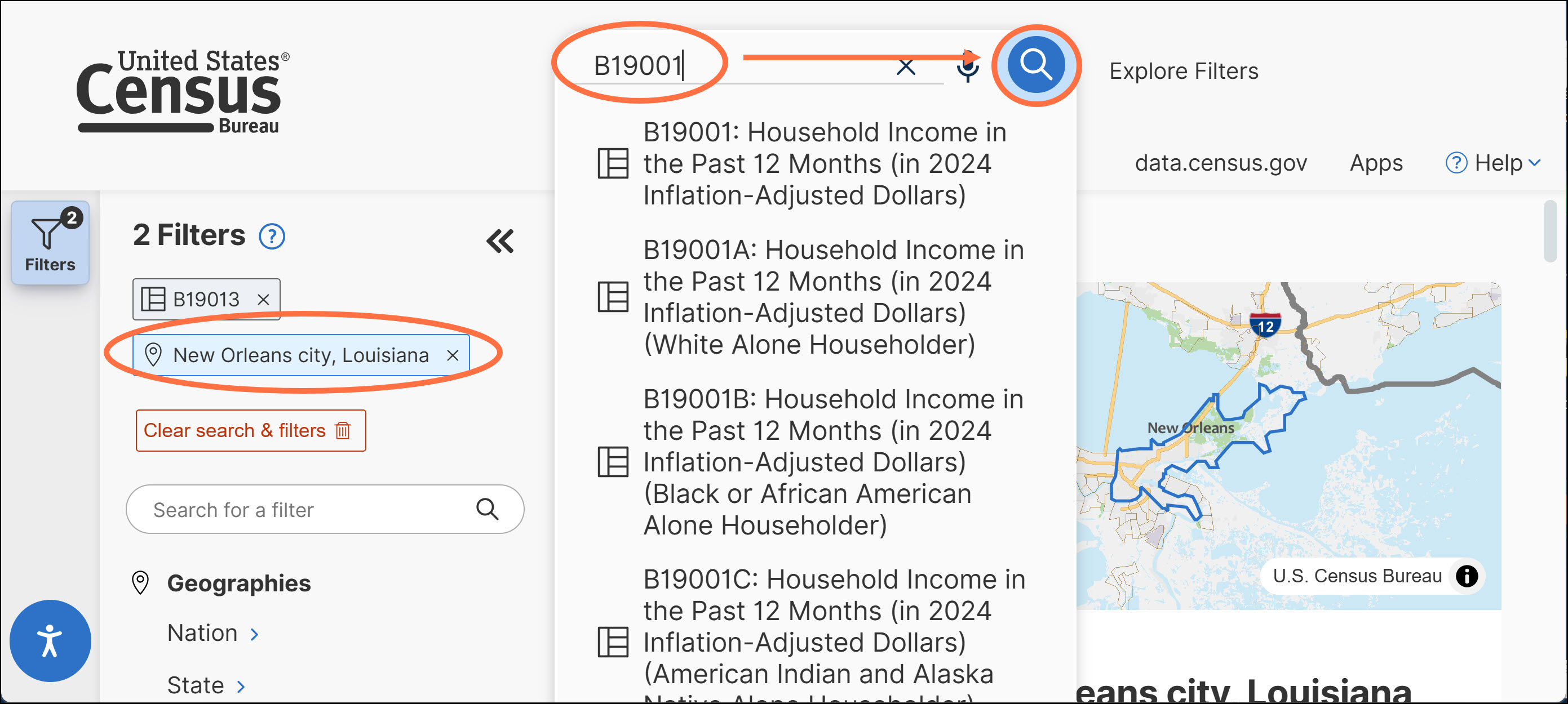 Then when you are ready to search for a new table ID, you can click into the single search bar at the top of the page to type a new ID (example: B19001), and press enter. Be sure to click the magnifying glass if you want your other filters to remain in the updated search. See the FAQ: How Can I Keep My Geographies When Searching for a New Table for more details.