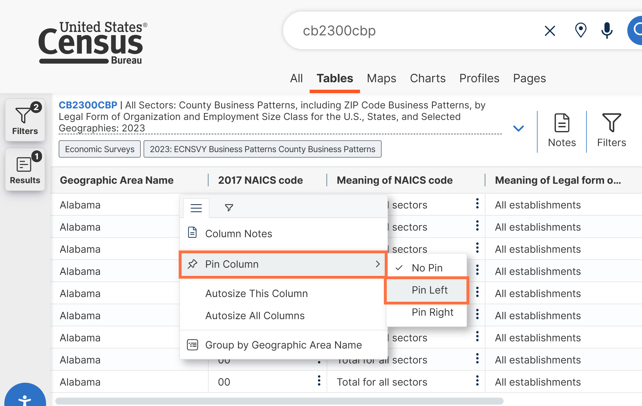 Functionality on data.census.gov allows you to pin columns in a table so it stays in view as you scroll horizontally. You freeze the column by following these steps: