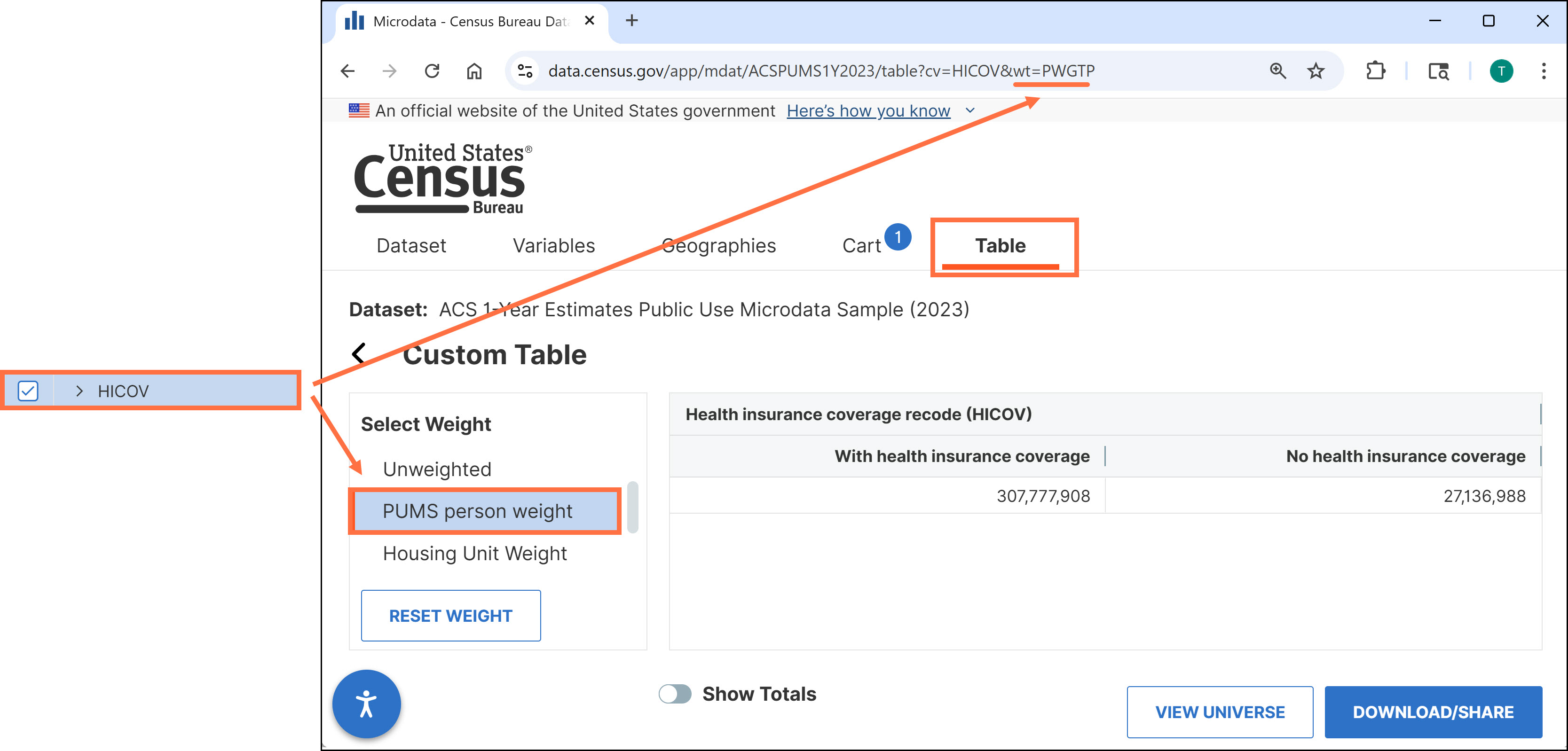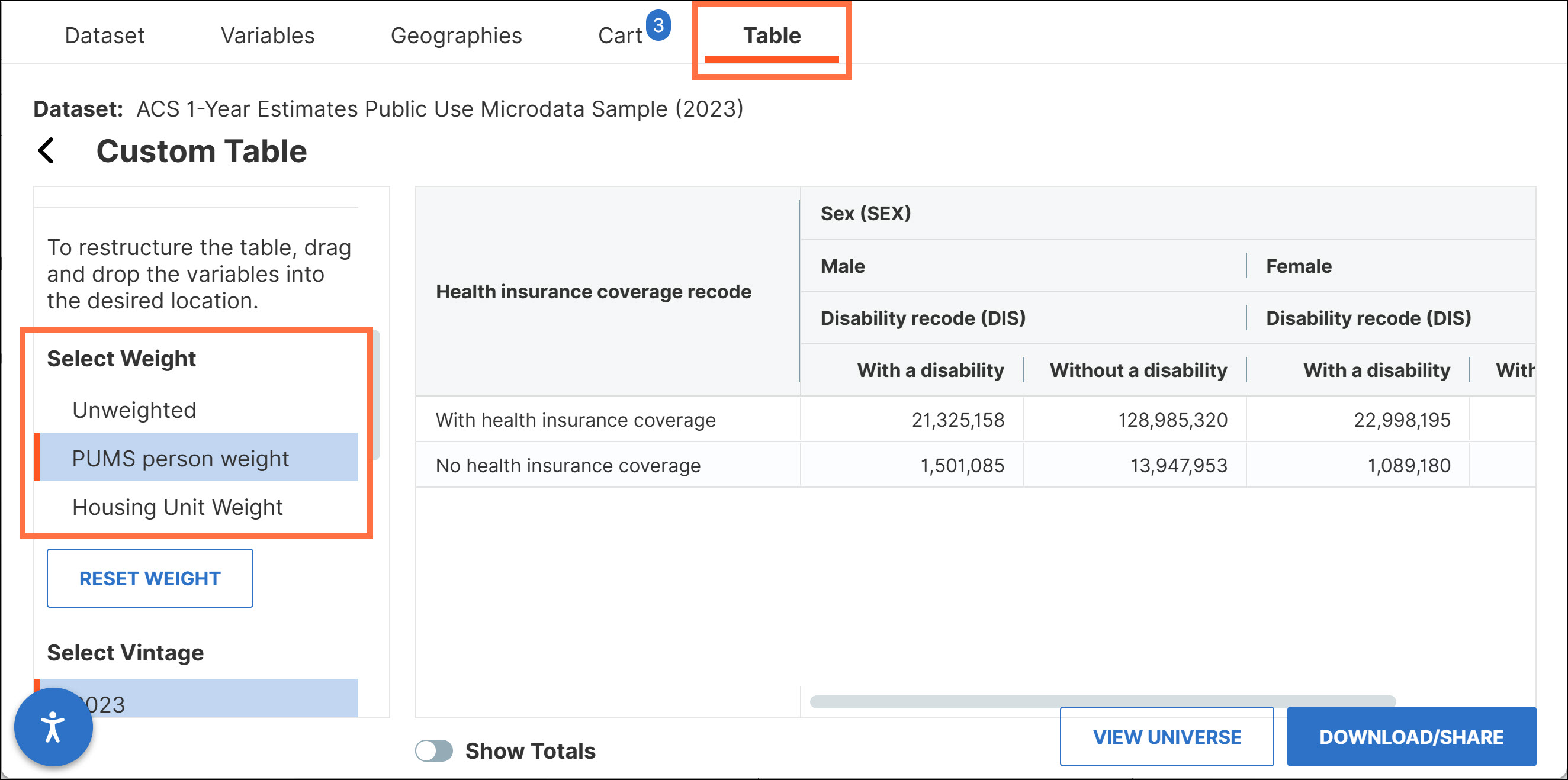 Because data in the Microdata Access Tool are based on survey samples, you must apply a statistical weight to make sure the data represent the overall population. In most cases, the site automatically applies a suggested weight using the first variable you selected.