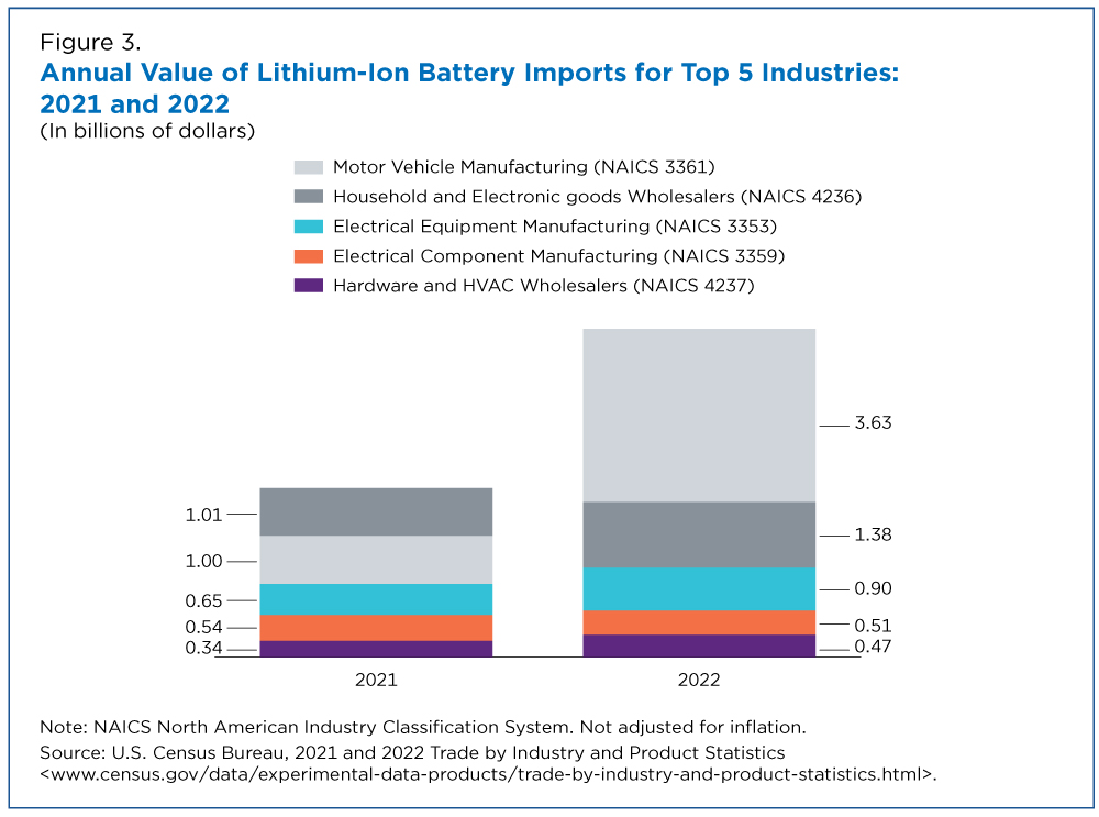 Figure 2 shows the top five industries that imported the largest dollar values of lithium-ion batteries in 2022.