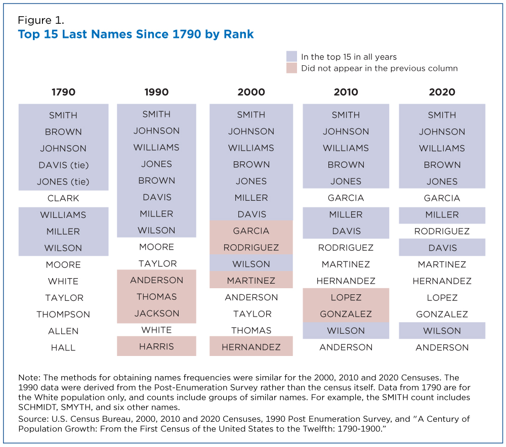 The top five last names (Smith, Johnson, Williams, Brown and Jones) were the same for three decades — 2000, 2010 and 2020 — and among the top 15 in 1790 (Figure 1).