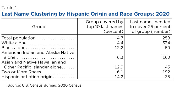 For example, people of Hispanic or Latino origin have the highest percentage of their population (14.2%) sharing the group’s top 10 last names (Table 1).