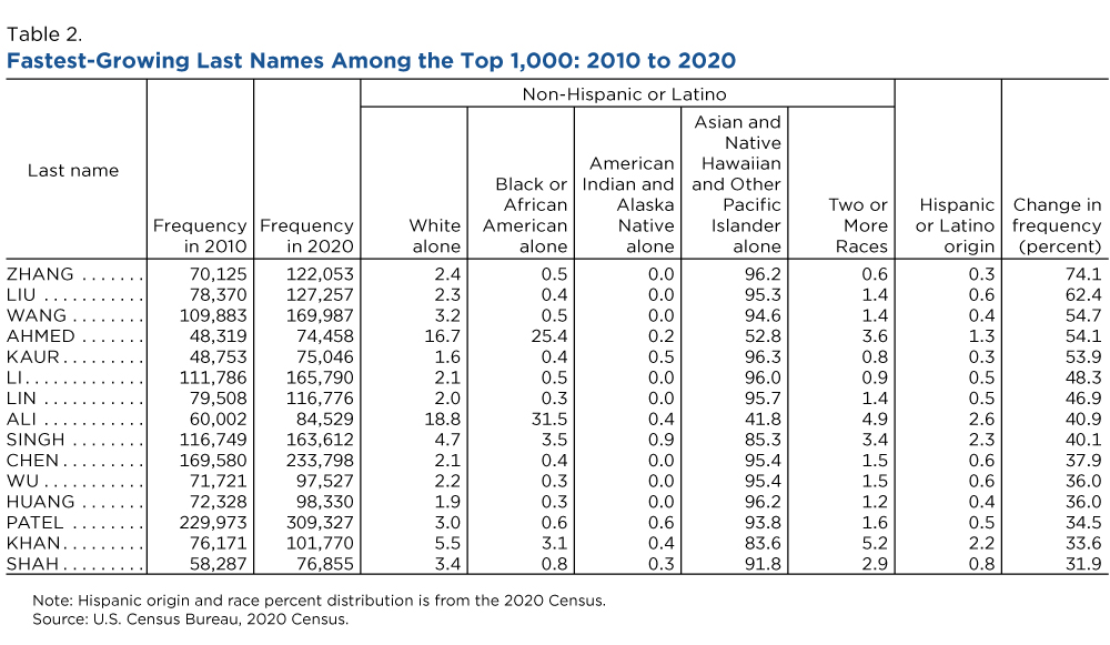 All but one of the fastest-growing last names among the top 1,000 were predominantly Asian between 2010 and 2020 (Table 2).