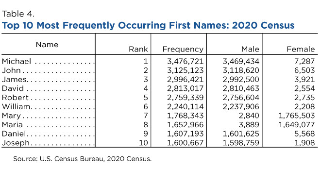 The U.S. Census Bureau today released the 2020 Names Data, which tallies rankings of the nation’s most popular monikers and how many people share each one.