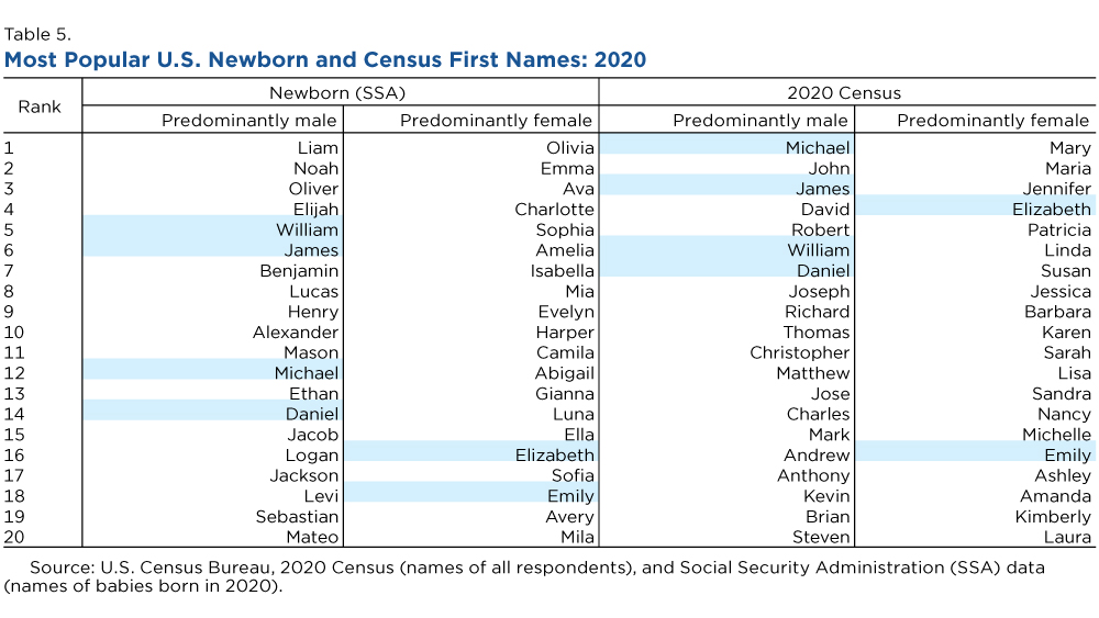 Comparing the 2020 first name datasets from SSA and the Census Bureau, there is little overlap between the two lists (Table 5). The SSA counts the names of the babies born in 2020, while the Census Bureau counts the names of all respondents.
