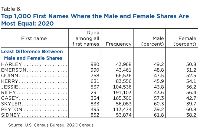 Some in the top 1,000 first names are close to a 50/50 split between the sexes (Table 6).