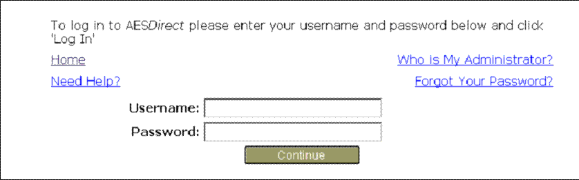 Similar to most commercial websites, AESDirect has added a function to the login authentication system that allows users to reset forgotten passwords on-line. This is done by providing responses to a set of security questions once logged in to any account. If the password is forgotten or expired, the user simply clicks on the “Forgot your password?” link. Then, he/she provides the correct response to one of the established security questions and the password may be reset online.