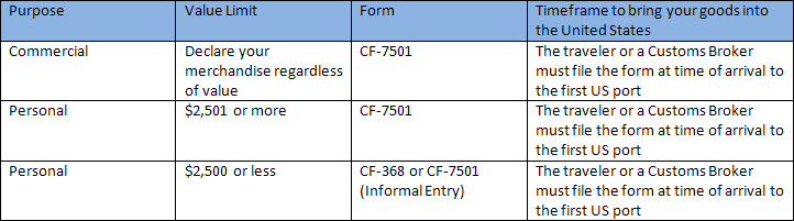 If your shipment is leaving the U.S. Virgin Islands and coming back into the United States, what do you file and when? This will depend on the purpose and the value. Take a look at the table below for guidance.